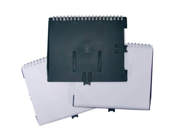 Porta spartiti con 10 buste trasparenti, misura 15 x 18 cm. Copertina in ABS colore nero e doppio attacco per lira.