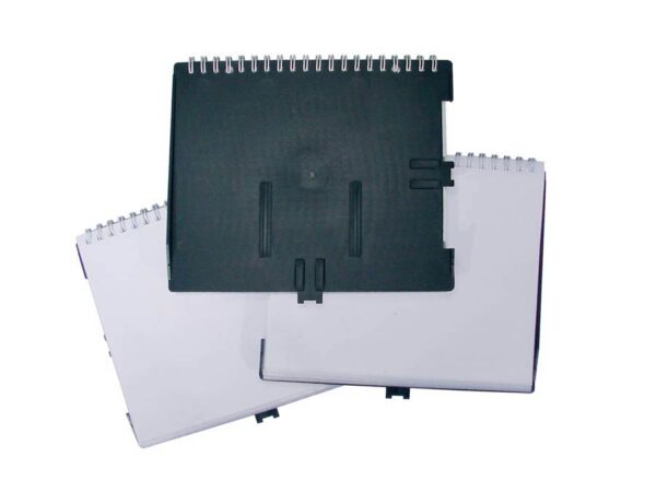 Porta spartiti con 20 buste trasparenti, misura 15 x 18 cm. Copertina in ABS colore nero e doppio attacco per lira.