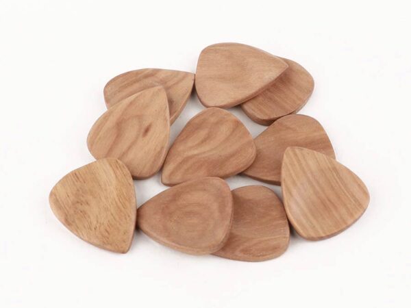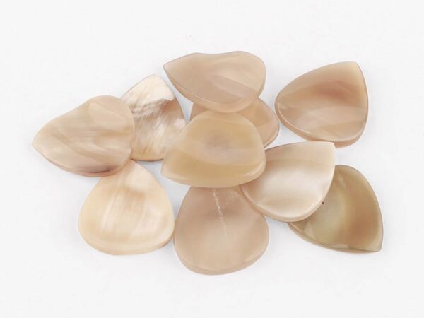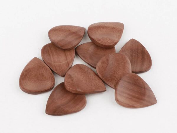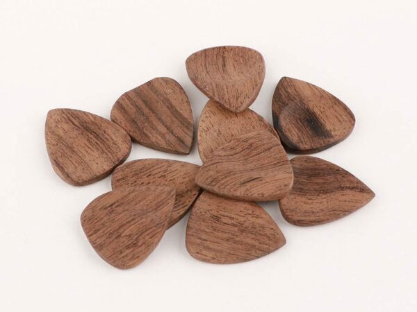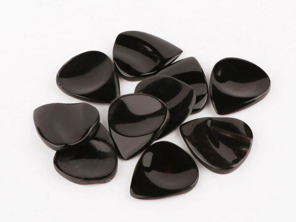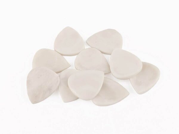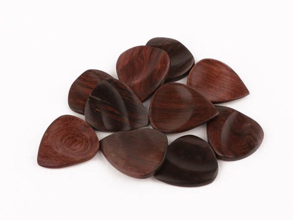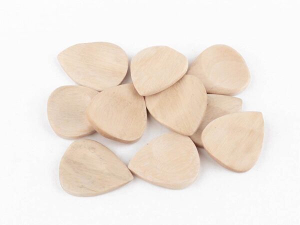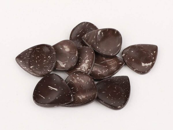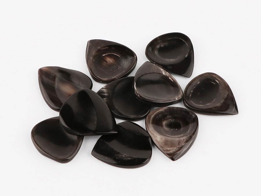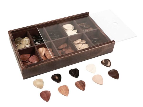 Scatola 100 plettri assortiti intagliati a mano, con ErgoGrip, standard RH: 10x corno chiaro, 10x corno misto, 10x corno scuro, 10x osso, 10x cocco, 10x legno di lomotra, 10x legno di nanto trasparente, 10x in andy wood, 10x in iron wood, 10x palissandro scuro.