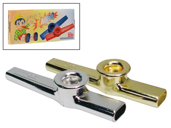 Set di 12 kazoo in plastica di cui 6 argentati e 6 dorati. Astuccio non incluso.