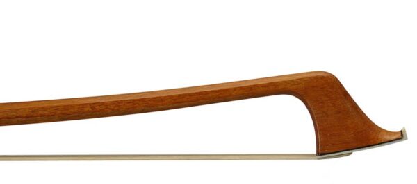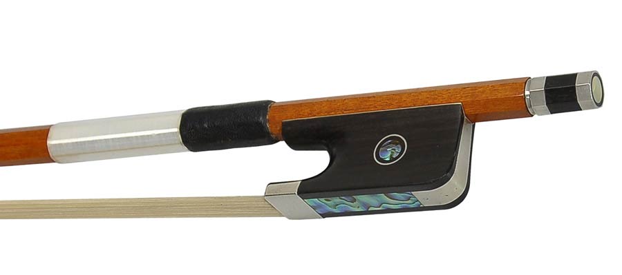 Arco da violoncello, misura 1/4, costruito in legno pernambuco. Bacchetta ottagonale, nasetto in ebano con occhio parigino. Scarpetta in osso di balena sintetico. Fasciatura in nickel.