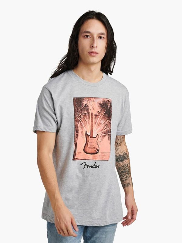 Dreaming of a vacation, our Fender® surf tee is the perfect escape! This soft cotton blend in gray heather with a tropical center print will have you longing for those relaxing days once again.