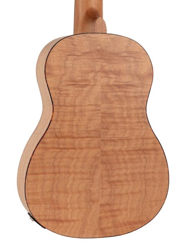 Ukulele basso in okume fiammato con tastiera e ponte in palissandro. Dotato di un elegante binding tartarugato, di un sistema di elettrificazione Belcat con accordatore incorporato e di trussrod. Monta corde Aquila Thundergut in caucci e meccaniche pressofuse. Disponibile anche in versione fretless (UKBB-310-FE).