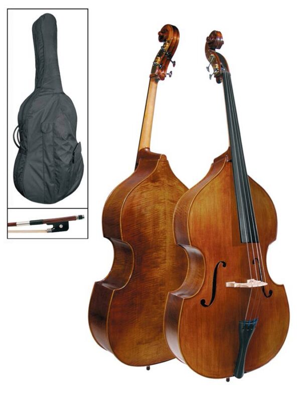 Set contrabbasso 4/4, costruito in legno massello (piano armonico in abete e fondo, fasce e manico in acero), verniciato ad alcool con finitura antichizzata. Tastiera in ebano. Arco e borsa inclusi.